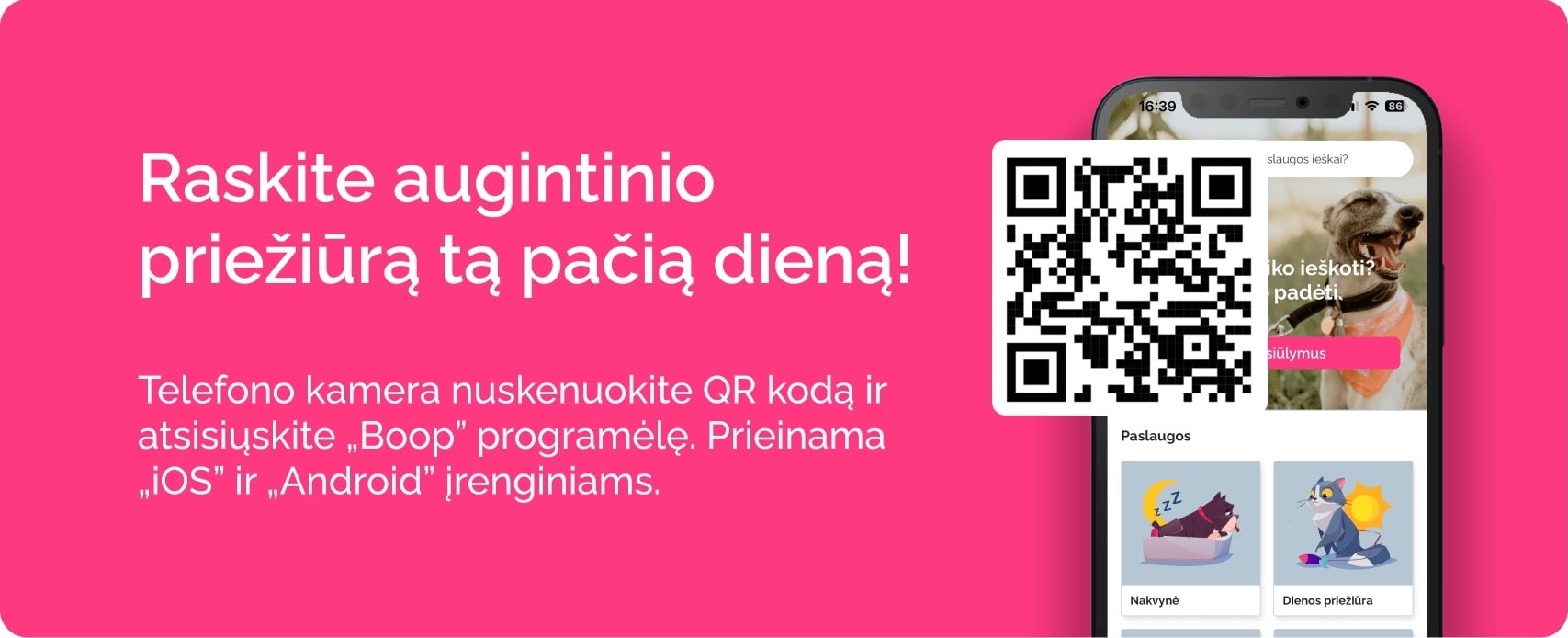 Šunų priežiūra, kačių priežiūra ir kitų gyvūnų priežiūra Boop platformoje atliekama patikimų auklių jų namuose. Auklių Lietuvoje yra daugiau nei 10,000. Jūs pasirenkate augintinių auklę pagal lokaciją, atsiliepimus ir kainą. Galite susisiekti, susitarti dėl susitikimo ir rezervuoti paslaugą per programėlę. Tai veikia paprastai, greitai ir patogiai – be skambučių ar ilgų susirašinėjimų.
