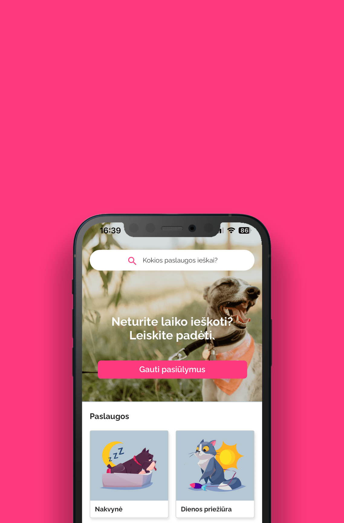 Įkėlus augintinio priežiūros skelbimą – prižiūrėtojai jums patys teikia pasiūlymus programėlėje.